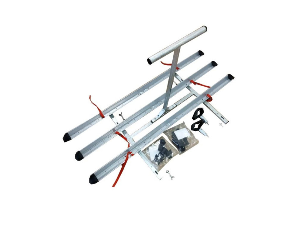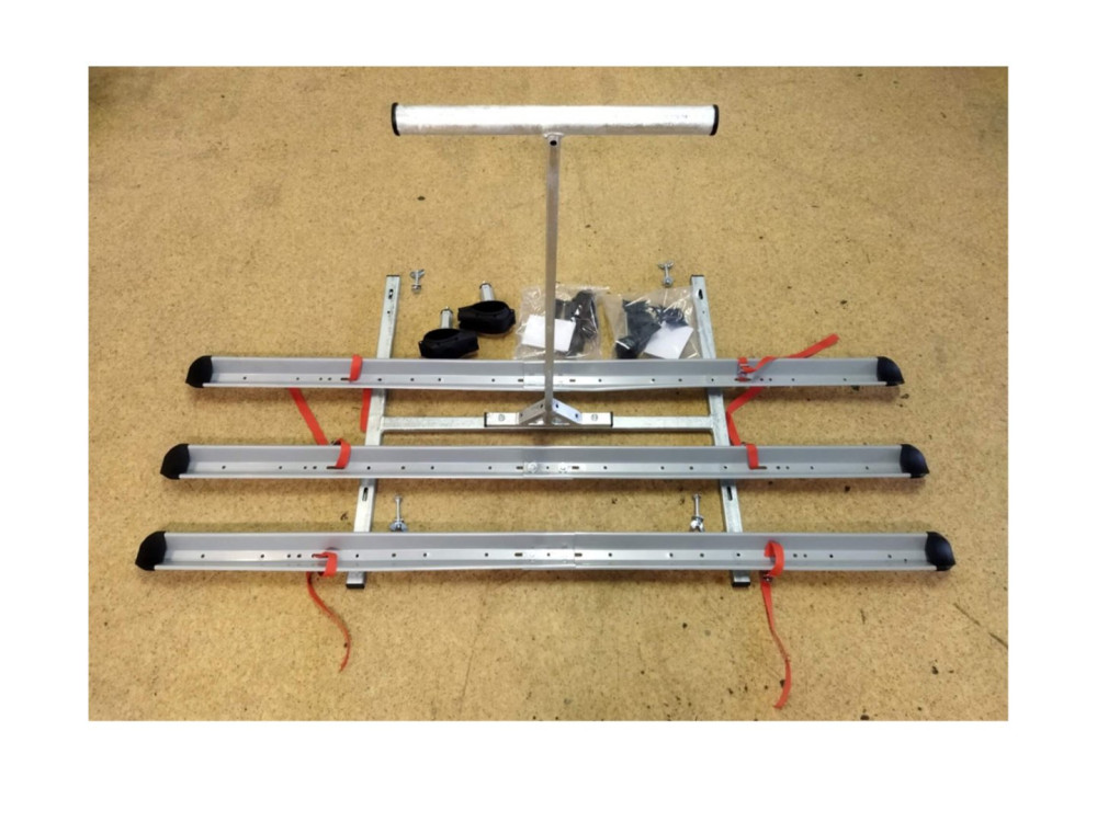 Vas, tűzihorganyzott adapter konstrukció, kerékhornyok, 3 kézi keréktartó, összekötő anyag, kötőszalagok.