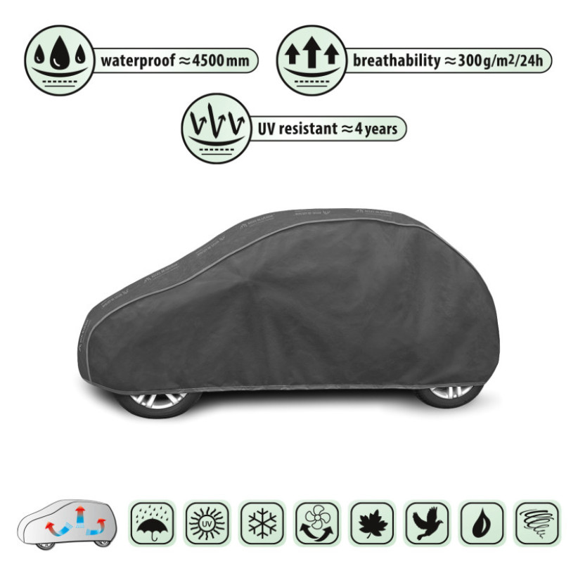 • Egész éves védelem – hatékonyan óvja a járművet eső, hó, szél, por, levelek, madárürülék és káros UV-sugárzás ellen.