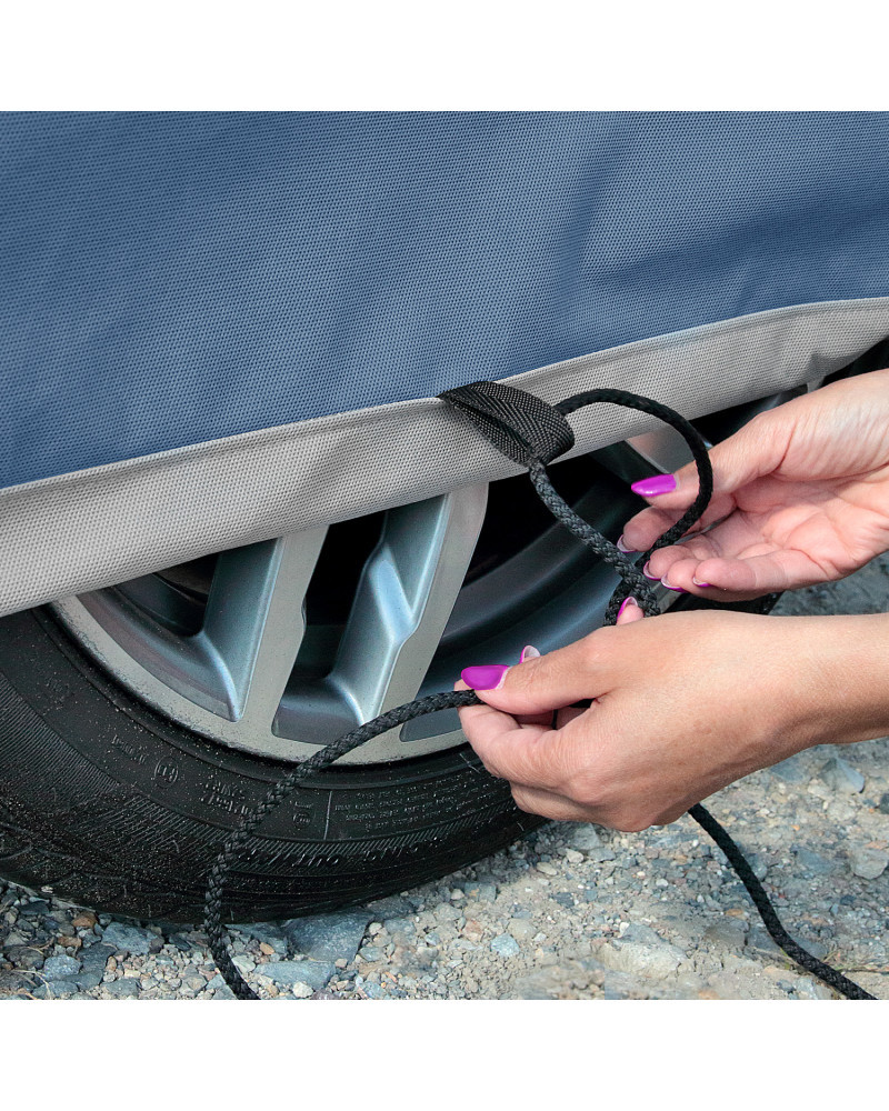 • Erős rögzítés – hagyományos zsinóros rendszer az egész kocsi körül, biztonságos erős szélben is.