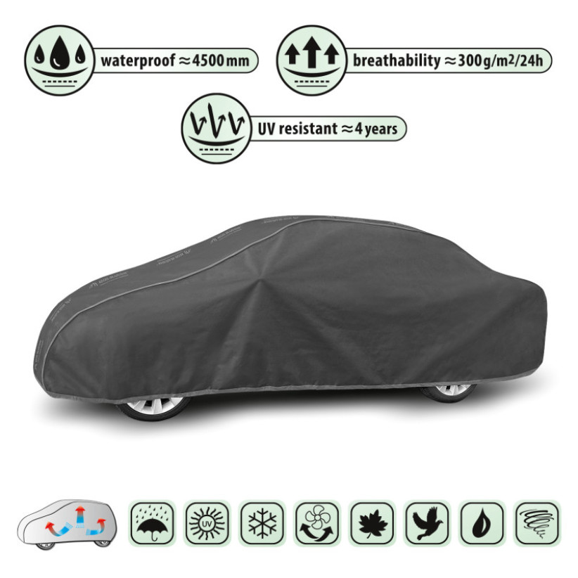 • Egész éves védelem – hatékonyan óvja a járművet eső, hó, szél, por, levelek, madárürülék és káros UV-sugárzás ellen.