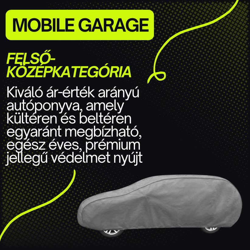A Kegel-Błażusiak Mobile Garage autóponyva egy felső-közép kategóriás autóponyva, amely kiemelkedő minőségű, prémium jellegű védelmet nyújt egész évben, megbízhatóan óvva autóját az időjárás és a szennyeződések hatásaitól. Fejlett 4 rétegű szerkezete biztosítja a vízállóságot és a légáteresztést, így hatékonyan védi a járművet a korróziótól, penésztől, UV-sugárzástól és karcolásoktól. Ideális választás azok számára, akik a Basic és az Optimal Garage szintjénél fejlettebb, tartósabb megoldást keresnek.