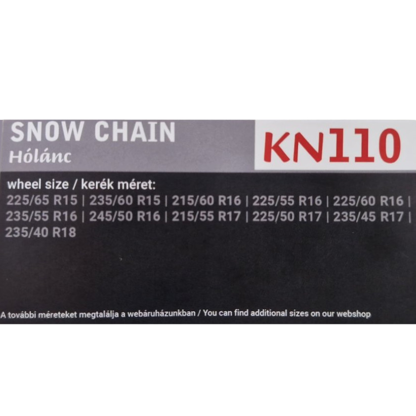 TÜV-GS minősítéssel rendelkezik. Könnyen felszerelhető és leszedhető. Rombusz mintázat Méretek: 3 mm / 9 mm A csomagolás 2 db hóláncot tartalmaz. A téli autózás fontos kelléke a csomagtartóban elhelyezett hólánc. Néhány szomszédos országban a hólánc megléte kötelező, használatát az útviszonyoknak megfelelően elrendelhetik. A hóláncot mindenkinek a gumiabroncs mérete alapján kell kiválasztani.Vannak, akik csupán azért vásárolnak hóláncot, hogy szükség esetén bemutassák a szomszédos országaink hatóságainak, de az ő esetükben is javasolt, hogy ha már pénzt szánnak rá, akkor a megfelelő méretet válasszák. Az alábbi gumiabroncs méretekhez használható: 15" 205/75 R15, 225/65 R15 16" 215/60 R16, 225/55 R16, 225/60 R16, 235/55 R16 17" 225/55 R17, 245/45 R17, 255/40 R17 18" 235/45 R18, 245/40 R18, 255/35 R18