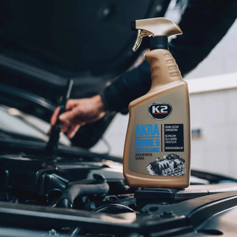 K2 AKRA folyadék a motor és más erősen szennyezett autóalkatrészek mosására. Kiszáradt lerakódások, üzemi folyadékok foltok, por, megkeményedett szennyeződések és illékony rozsda eltávolítására szolgáló termék.