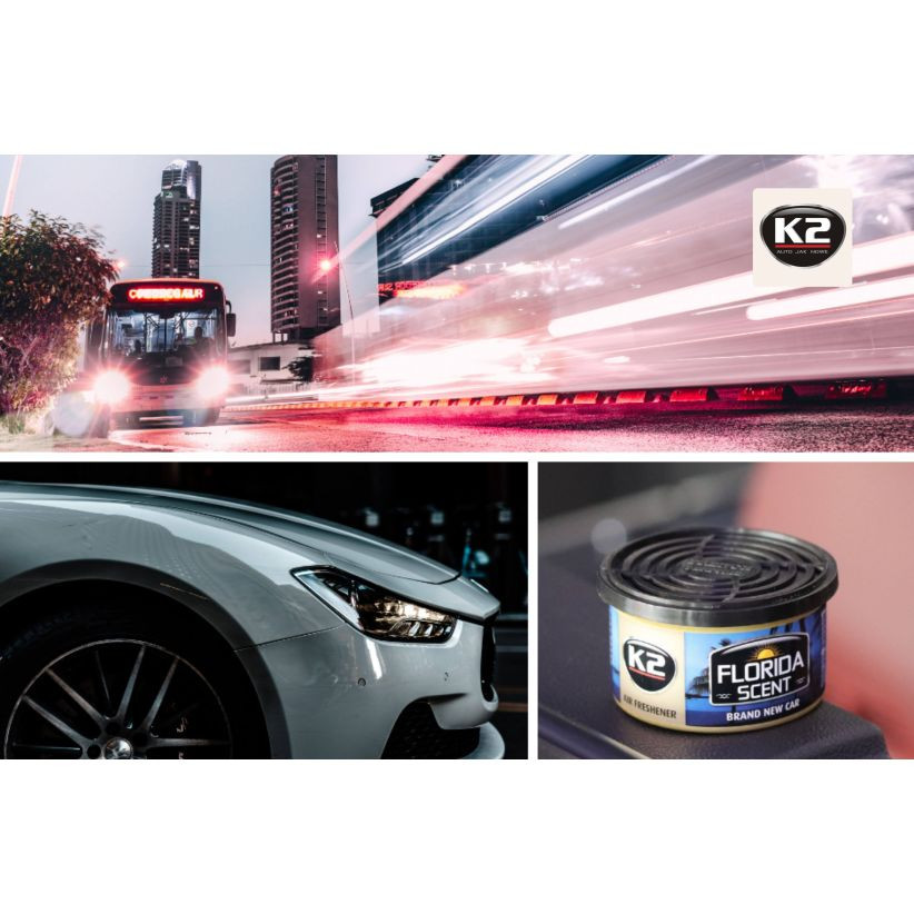 A K2 Florida Scent autóillatosítót úgy tervezték, hogy folyamatos és hosszan tartó illatot biztosítson az autó belterében. Az illatosító belsejében aromás olajokba áztatott gyapjútömbök találhatók, amelyeket energikus illatjegyek alapján fejlesztettek ki.