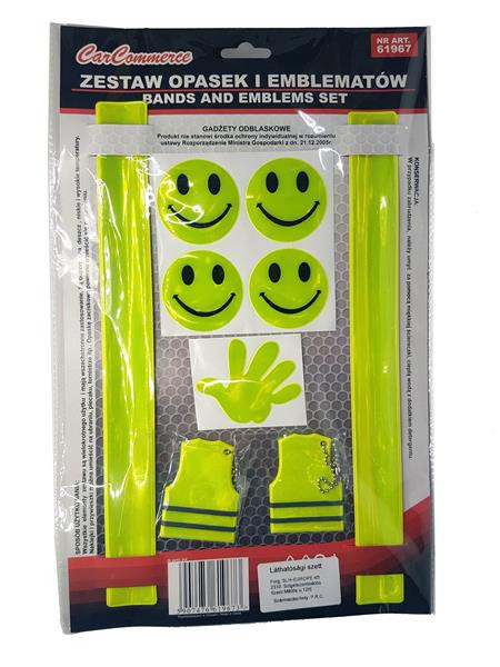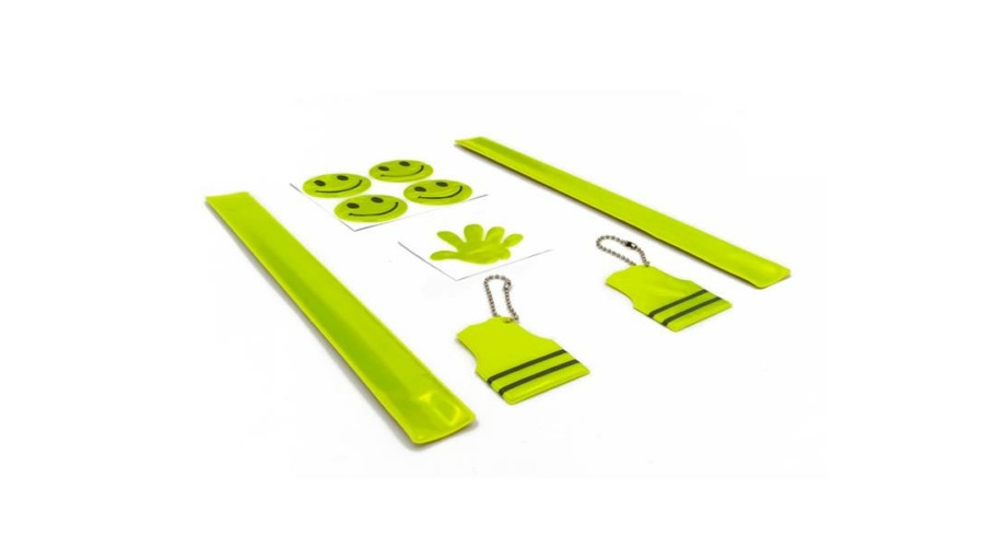 Fényvisszaverő láthatósági szett 9 részes karpántokkal, kulcstartókkal, matricákkal Már messziről is jól látható lesz a sötétben. A készlet tartalma:– 4 db smile Ø5 cm (matrica)– 1 db mancs 6,5x5,5 cm (matrica)– 2 db mellény 4x6 cm (kulcstartó)– 2 db karszalag 3x30 cm (öngördülő)