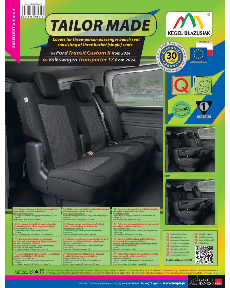 Prémium minőségű, teljesen méretpontos Kegel üléshuzat Ford Transit / Tourneo Custom modellekhez. Tökéletes illeszkedés, légzsák-kompatibilis kivágások, tartós és könnyen tisztítható anyag. Ideális védelem a gyári kárpit számára mindennapi használathoz.