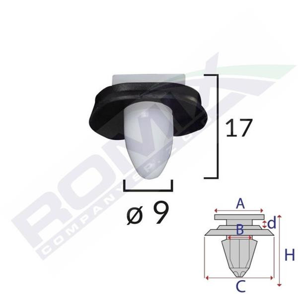 Méretek: A: 12 mm x 10,6 mm B: 8,8 mm C: 16,9 mm D: 1,7 mm H: 17 mm Lyuk átmérő: ø 9 mm