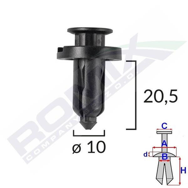 Méretek: A: 19,8 mm B: 9,6 mm C: 13,7 mm D: 3,9 mm H: 20,5 mm Lyuk átmérő: ø 10 mm