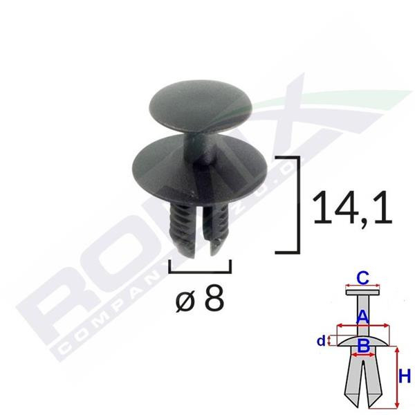 Méretek: A: 20,3 mm B: 8 mm C: 15,3 mm D: 2,4 mm H: 14,1 mm Lyuk átmérő: ø 8 mm