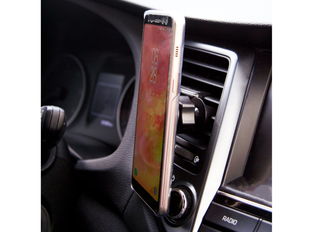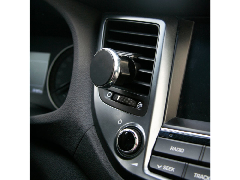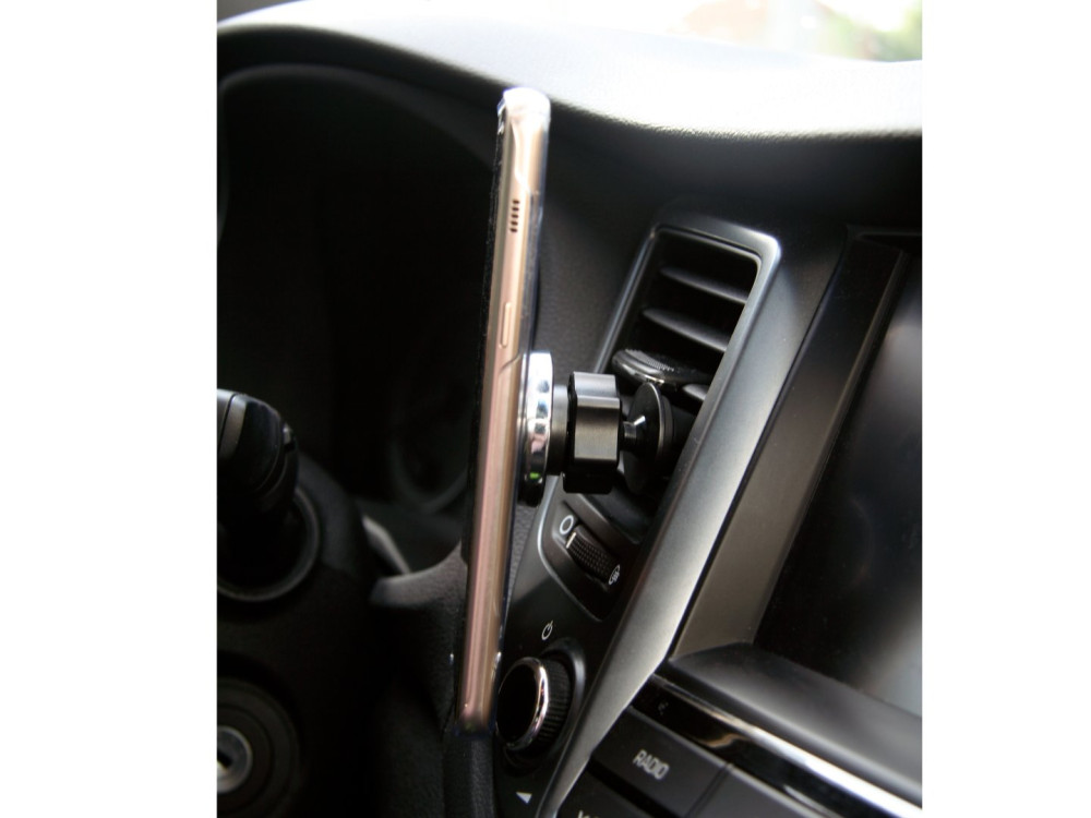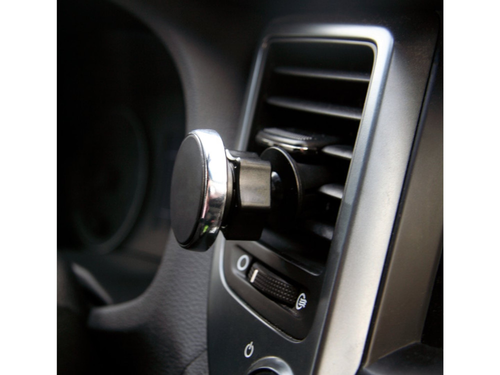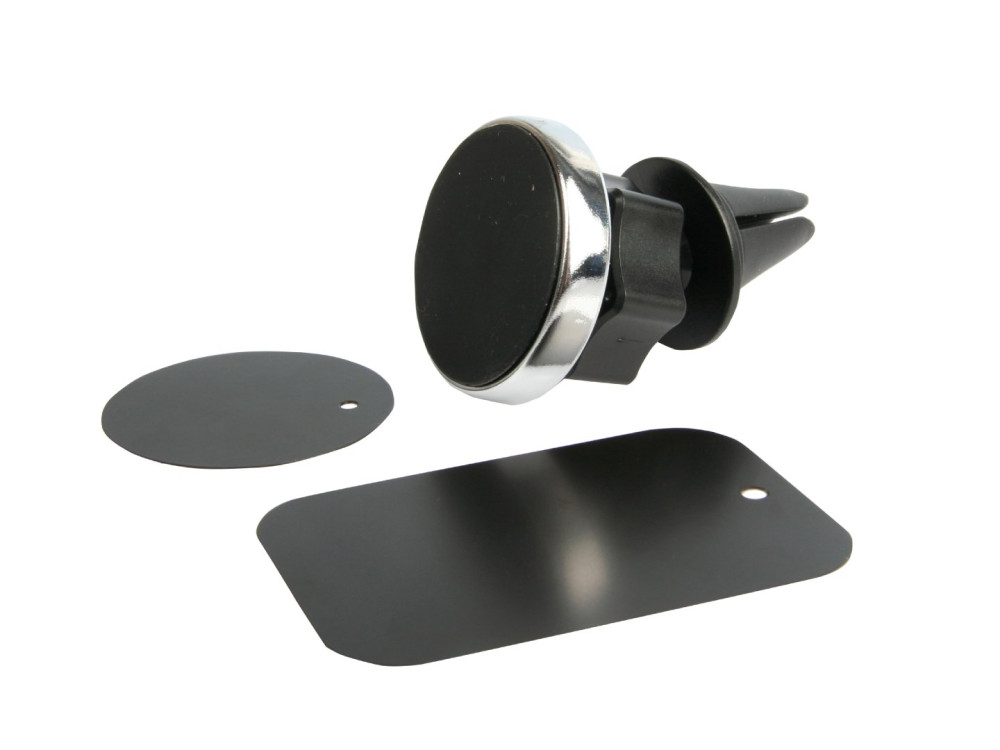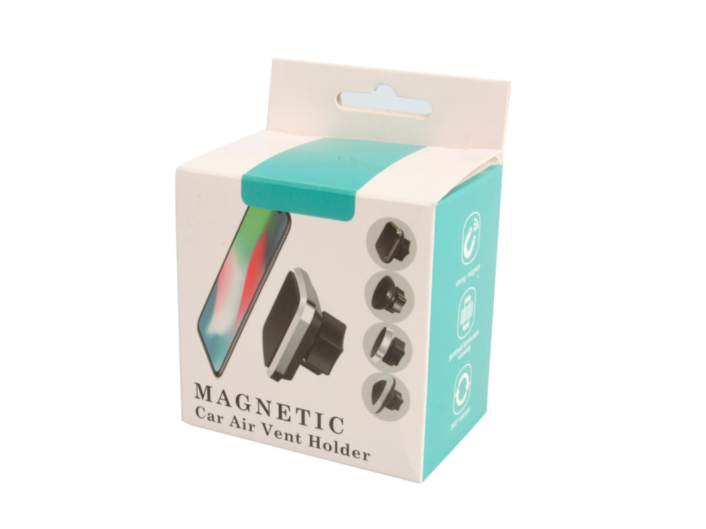 Univerzális mágneses telefontartó, mely egyszerűen rögzíthető a klíma szellőzőjébe. A tartó kialakítása lehetővé teszi a telefon tetszőleges szögben való rögzítését. A csomag tartalmaz öntapadó mágneses matricákat is, amit a telefon hátlapjára kell ragasztani.