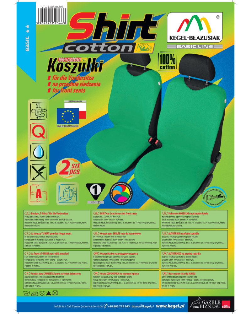 A SHIRT COTTON pólós üléshuzatok magas minőségű természetes anyagból (100% pamut) készültek. A természetes pamut nagyon kellemessé és testbaráttá varázsolja a huzatokat, és nem termelnek statikus elektromosságot. A huzatok nagyon jól igazodnak és tapadnak az autó üléseihez, az anyag belső oldalán lévő laminált PUR hab pedig megakadályozza az elmozdulást. A pólóhuzatok befedik az ülés teljes használható felületét, így jobban védik a sérülésektől és a szennyeződésektől. A huzatok nem takarják el az ülések oldalát, így biztonságosan használhatók légzsákos üléseken.