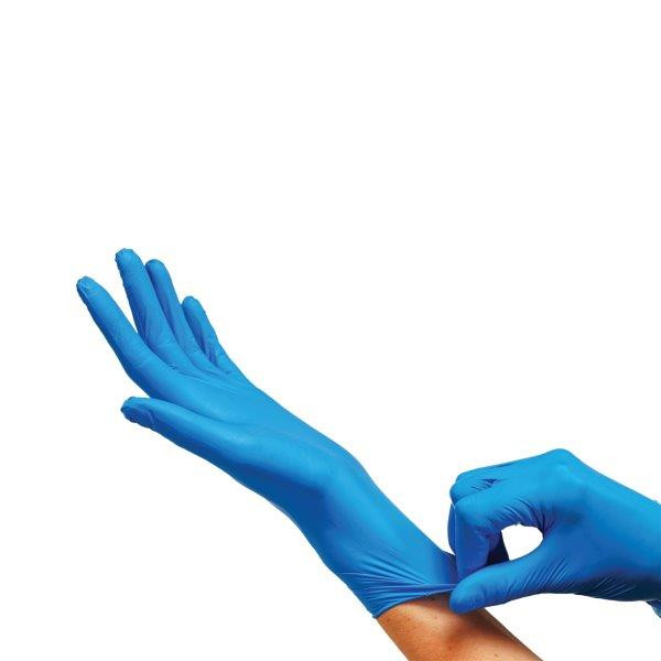 Púdermentes, egyszer használatos, kék színű Anyaga: nitril Hossza: 240 mm