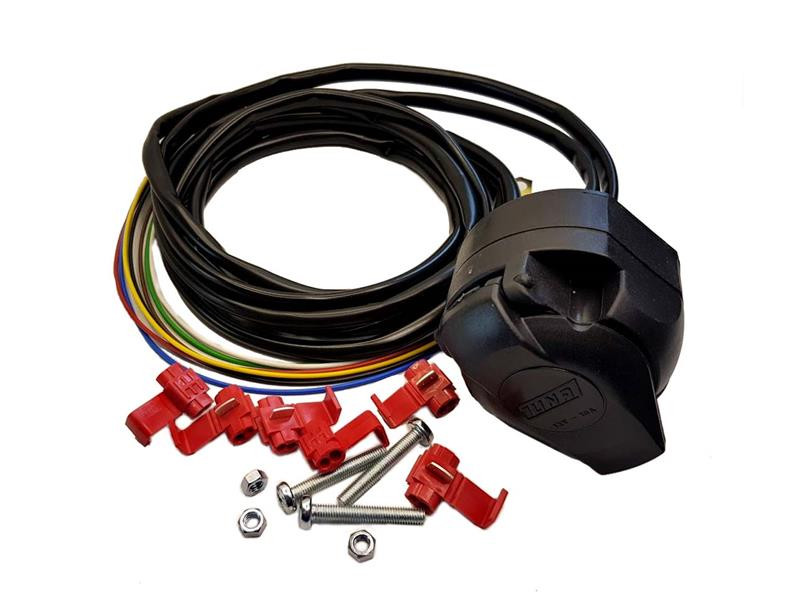 Univerzális 7 pólusú vonóhorog csatlakozókészlet 190 cm-es kábellel, mely ideális választás utánfutók, lakókocsik vagy kerékpárszállítók gyors és biztonságos elektromos csatlakoztatásához. Tartós, időjárásálló kivitel, könnyű telepítés.