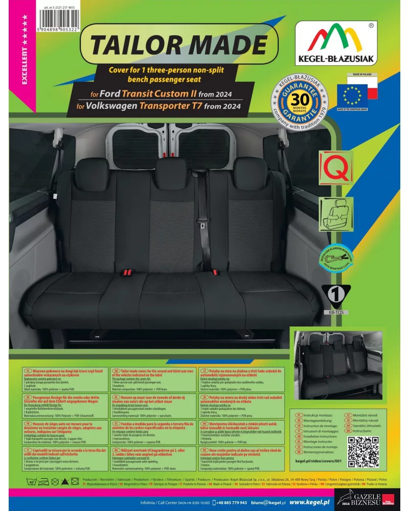 Prémium minőségű, teljesen méretpontos Kegel üléshuzat Ford Transit / Tourneo Custom modellekhez. Tökéletes illeszkedés, légzsák-kompatibilis kivágások, tartós és könnyen tisztítható anyag. Ideális védelem a gyári kárpit számára mindennapi használathoz.